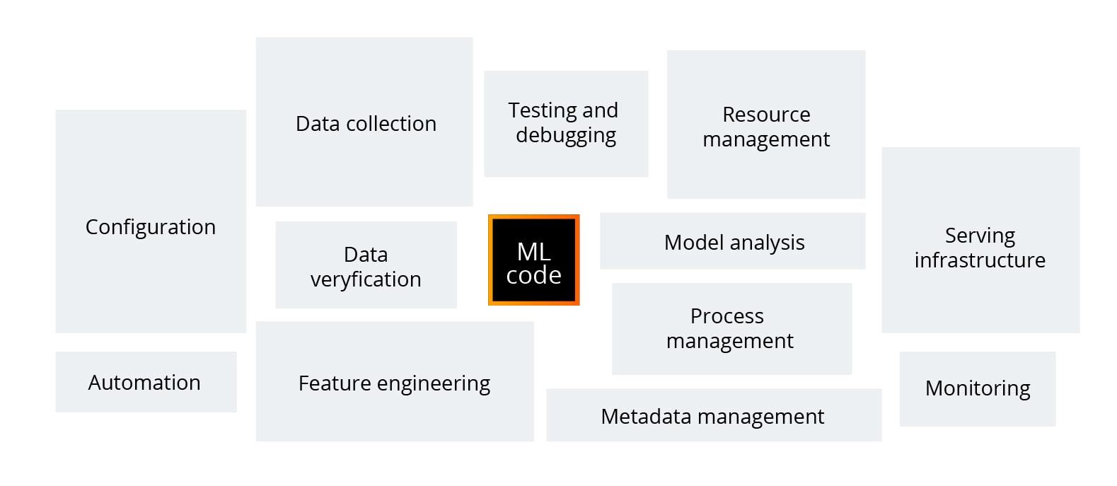 The aim of MLOps is to take care of the entire ML solution lifecycle in production, by monitoring and automating all steps of the solution. And by saying all steps, we don’t mean just the ML model. In fact, an ML solution is composed of a vast and complex range of surrounding elements, such as data collection, data verification, model analysis, testing and debugging, serving infrastructure, monitoring, and many more.