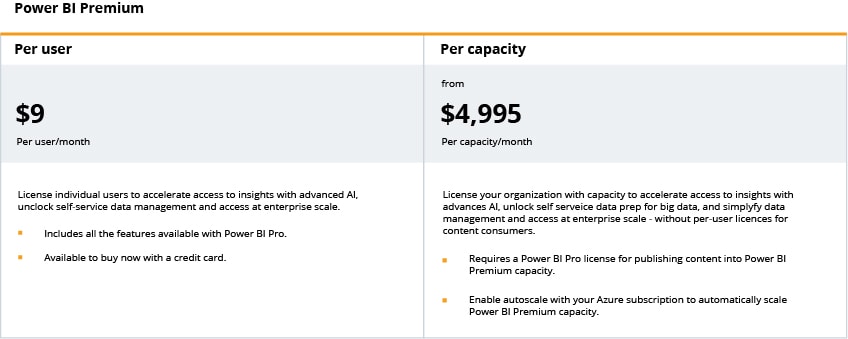 - Power BI Premium ($20 per user/month or $4,995 per capacity/month)