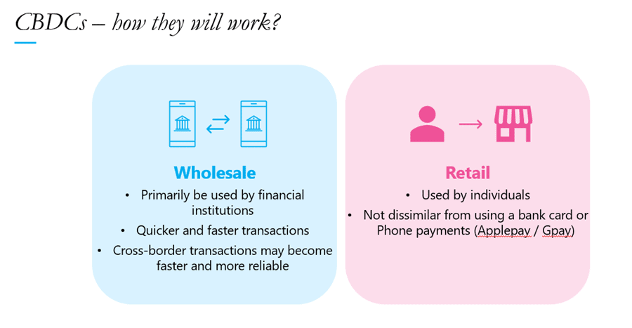 Retail CBDCs on the other hand, would primarily be utilised by individuals. ‘People could use them essentially as digital cash, with the comfort of knowing that the currency is issued and backed by the country’s central bank.’ stated Bob.