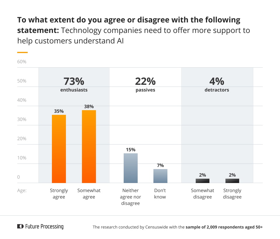 The survey conducted by Future Processing in the UK revealed a prevalent sentiment among respondents aged 50 and older. As the example of our statistically created Sharon showed, more than two-thirds of UK respondents aged 50 and above believe that technology companies do not do enough to help customers understand AI. This collective sentiment underscores the necessity for enhanced engagement in fostering an understanding of AI.