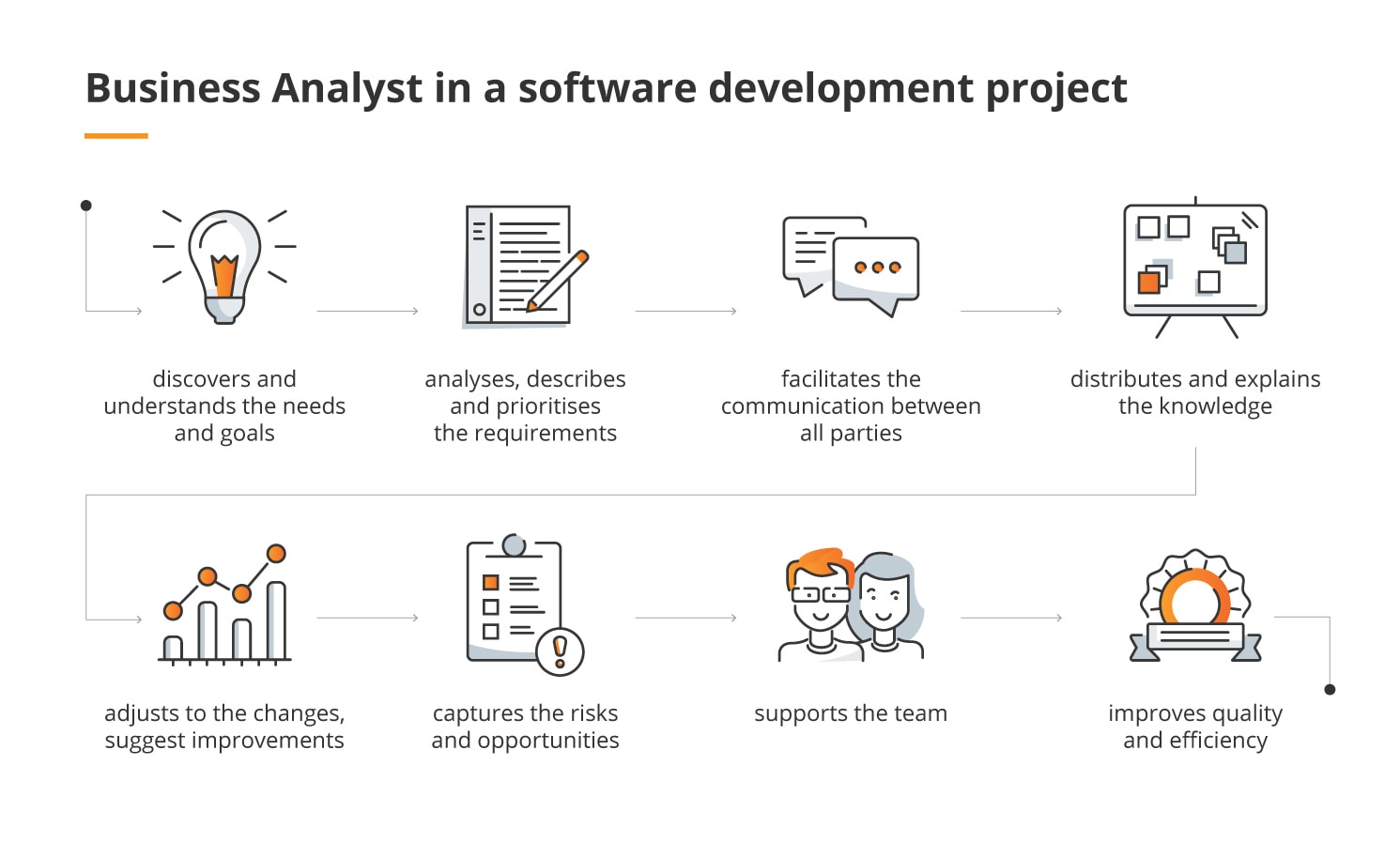 A business analyst has such situations under control as well. They are not only responsible for explaining the business goals to the development team, but also for quickly adjusting to any changes that influence the emerging application. They constantly monitor workflows and outcomes to be able to catch any problems early on, and make accurate and precise optimisations, whenever needed. Having a BA on the front line allows to early capture any risks or threats that could make the business goals difficult to achieve, and to prevent fires rather than having to put them out later.