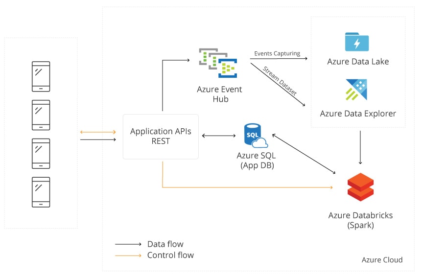 The data are sent from the mobile application to a dedicated endpoint (Rest API), which records telemetry data to Azure Event Hub, which acts as a buffer. Data from Azure Event Hub: