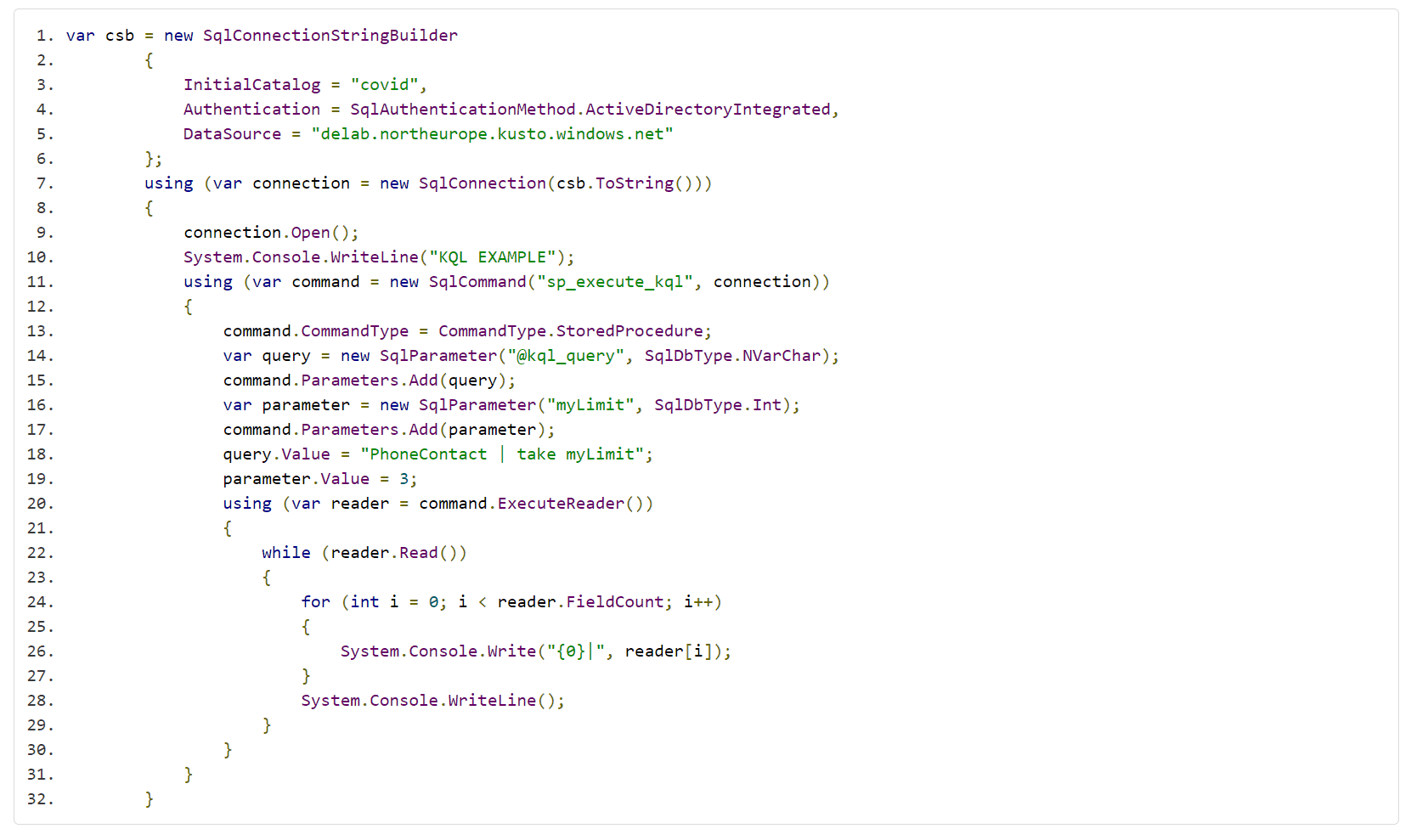 The access to the Data Explorer cluster is made possible with the SQL driver and the KQL code is executed via the sp_execute_kql procedure. As a result, such query can be made directly from the app when the data about infections have been loaded.