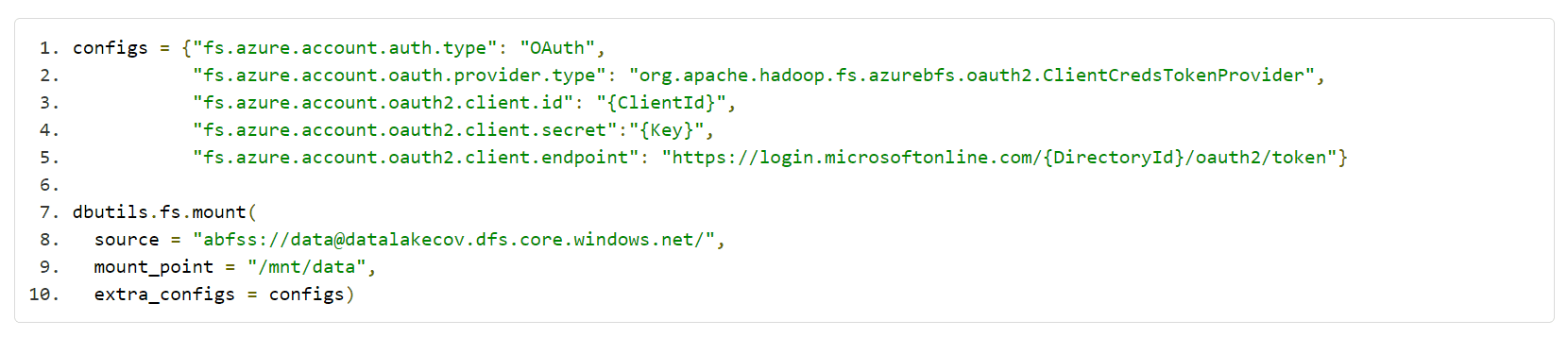 - mount Azure Data Lake so that it is available in Azure Databricks – you can use the following script (one-time operation),