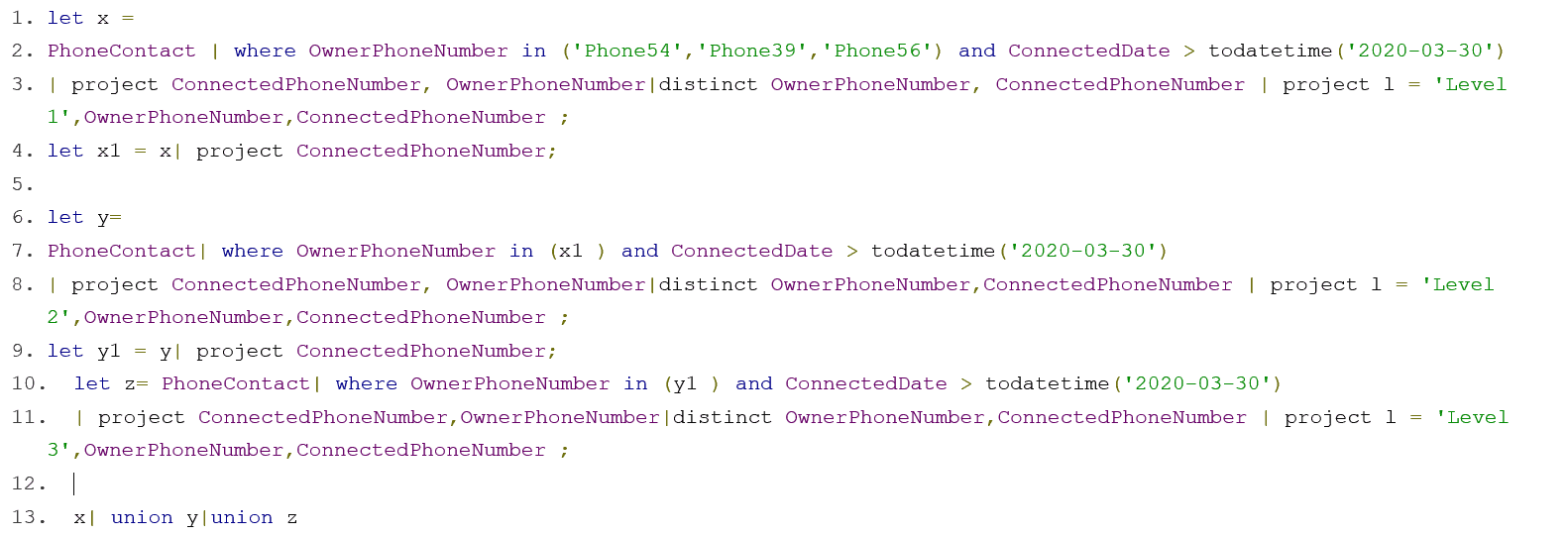 In the case of Azure Data Explorer, data processing, including matching data from phones with the data about identified confirmed cases of infection, can be carried out with a query in KQL. An example of such a query is shown below: