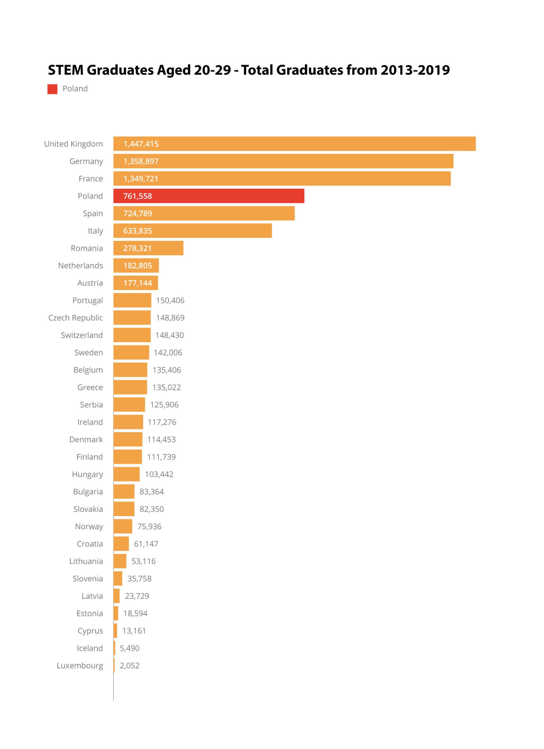 What is more, Poland ranks #4 in Europe in terms of most STEM graduates. The country itself is a great place for big companies to invest, which is seen on the example of Google, Microsoft and Intel. It is also the one attractive for tech startups as they can count on public funding.