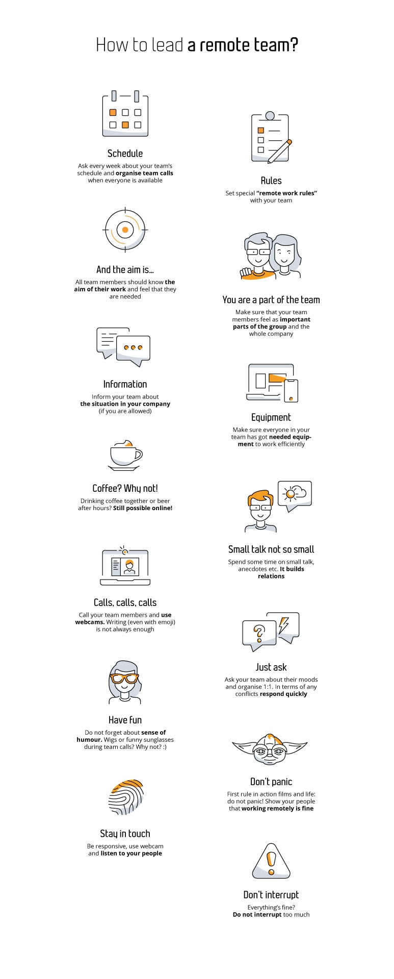 Working remotely influences one’s motivation. Ask your team members about their moods and draw conclusions regarded to individuals and the team. In terms of any conflicts in your team – respond quickly and make sure everyone can share their voice. Organise some 1:1 calls with webcams, appreciate one’s work and responsiveness. Ask your team about any ideas when it comes to improvements.