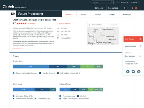 “We’ve been collaborating with Clutch.co for over two years now. During that time, we saw 650% increase of traffic from clutch.co and services such as themanisfest.com and Visual Objects. This is how Clutch.co became one of our top five web traffic sources. It’s also worth mentioning the quality of the visits we get from Clutch.co: it constantly improves, as proved by an average length of a session on our website (increase to almost two minutes). What’s more, Clutch.co provided us with a wider picture when it comes to analysing the market. Thanks to data we got from Clutch.co (such as statistics for each category and the number of visits to our website), we can accurately select groups of services and technologies with the best potential.”Marketing Data AnalystFuture Processing
