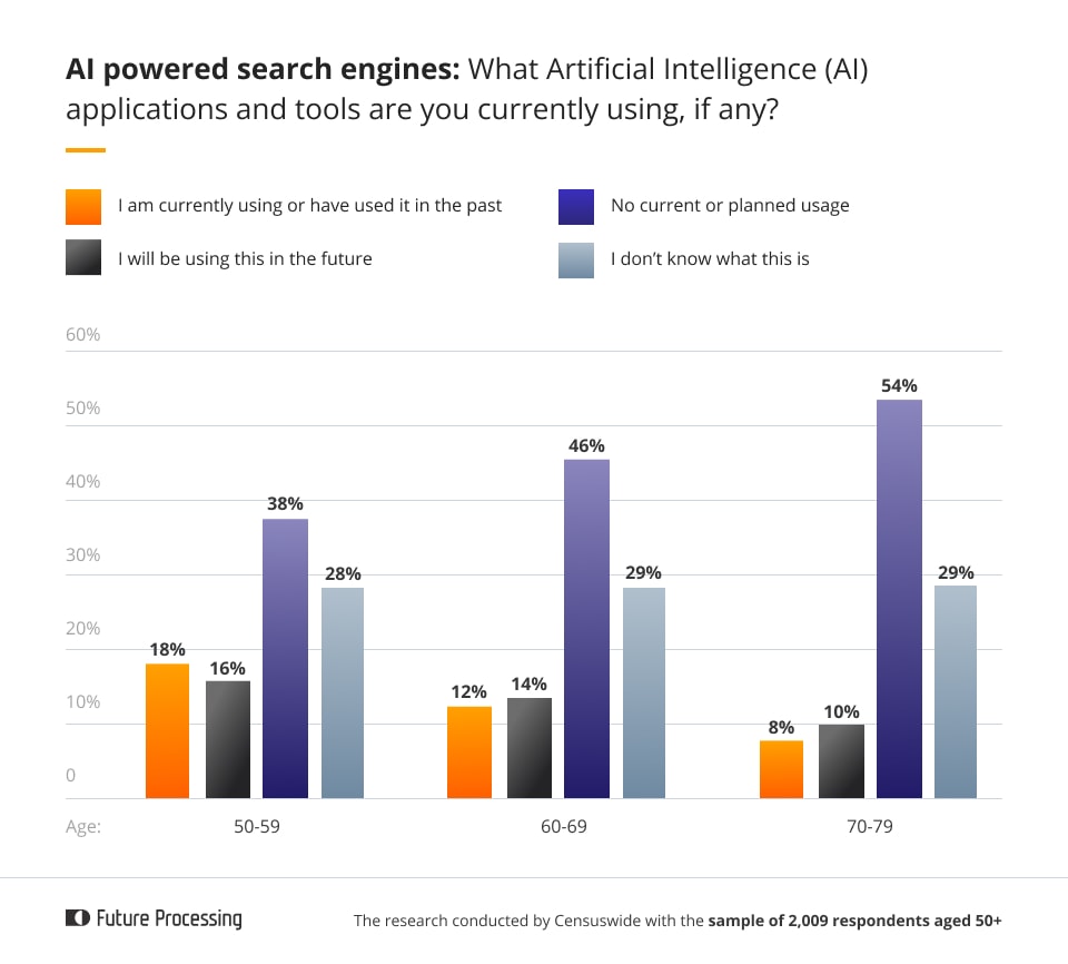 In the 70-79 age group, the tendency to not use it was even more pronounced – 54% did not declare any current or planned involvement. A significant 28% had no idea about AI-based tools, only 10% expressed interest in their future adoption, and 8% had previous experience.