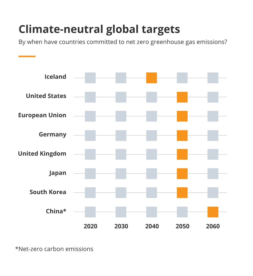 Recently, an increasing number of countries have begun to set some serious climate-neutral targets, with the most economically powerful ones committing to net zero greenhouse gas emissions by 2050 or 2060.