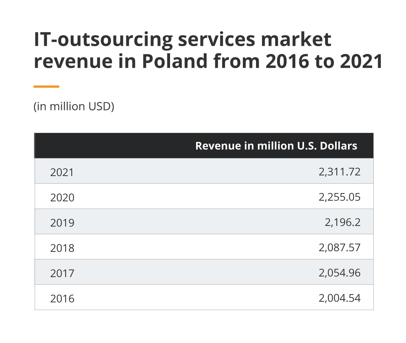 As shown by Statista, IT outsourcing services industry in Poland reached a record revenue of USD 2,255.05 million in 2020, marking five years of continuous growth, and a 112.5% increase from 2016.