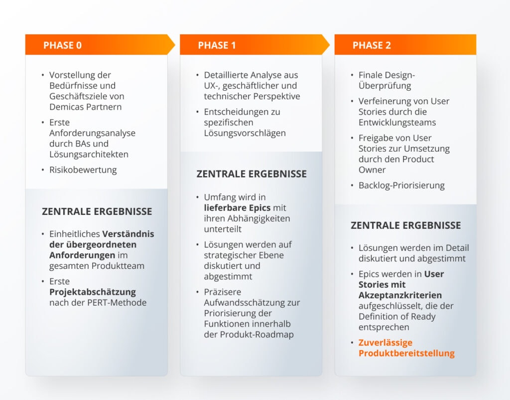 Dank eines klar strukturierten Ansatzes für Analyse, Design und Rollout bietet Demica seinen Kunden eine noch verlässlichere Lieferung der relevanten Plattformfunktionen innerhalb des bereits in der frühen Discovery-Phase geschätzten Umfangs, der Zeit und des Budgets.