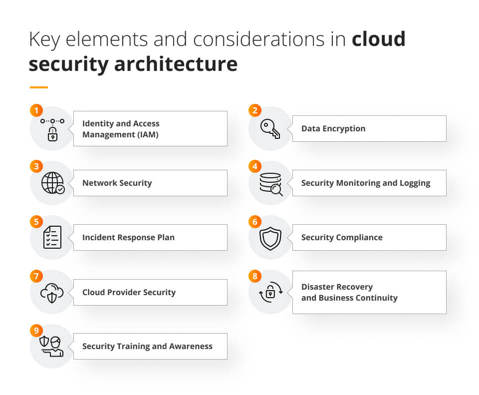 Key elements and considerations in cloud security architecture include: