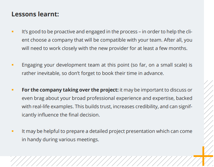 Apparently, handing over a project to another IT company requires weeks or months of combined effort, depending on the scale of the project. However, by putting the above-mentioned tips into practice, the process can be led in a much more manageable and smooth way than expected.