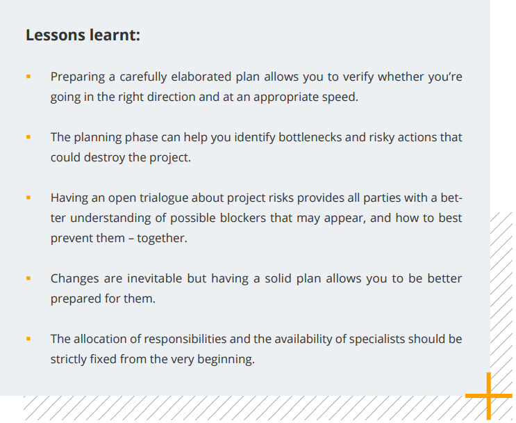 - Bi-weekly Governance Meetings – were held on the highest level, regarding, among others, contracts, critical problems, delays, along with analysing reports and emerging risks.