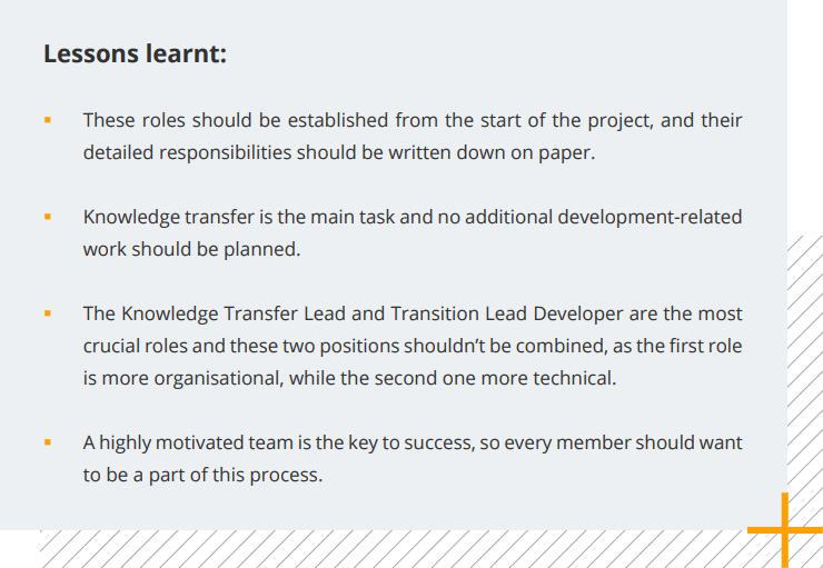 It is necessary to establish clear roles early on within each of the following three organisations: the company handing over the project, the company taking over the project, and the client.