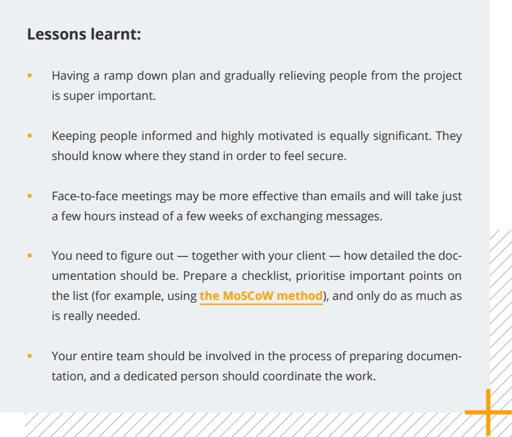 - If you’re the one handing over the project – create a gradual ramp down plan, keep your team motivated by organising their work in a thoughtful way and try to understand their needs and concerns.