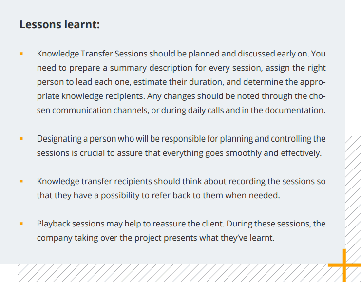 - Report on progress during daily stand-up meetings. Introduce Playback Sessions in order to make sure that the new provider has acquired all the knowledge presented during the Knowledge Transfer Sessions.