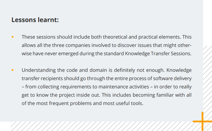 - Don’t forget about the practical side of the project – plan job shadowing and reverse job shadowing sessions. Bear in mind that the transition is not only about the code but also the tools to be used.