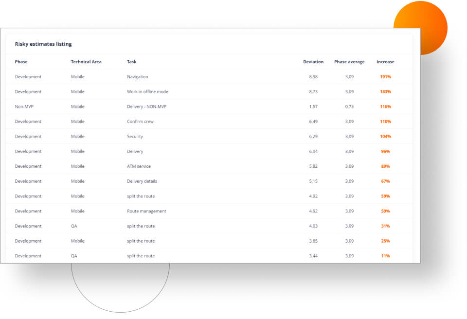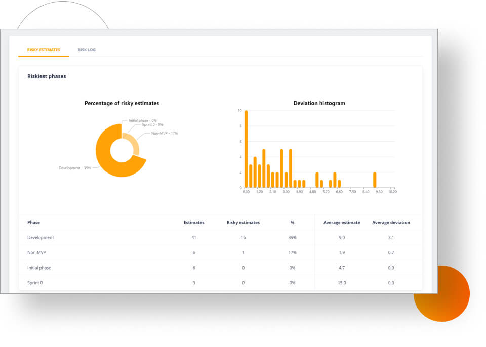 The risk report is divided into each phase of a project — and it contains a number of helpful features. For example, there is a chart showing the riskiness of individual phases and a histogram of optimistic, realistic, and pessimistic deviations of risky estimates for the entire project. Below this, there’s a table that shows how many estimates in a given phase have been defined as “risky”. Plus, you can see average deviations and average estimates. This allows users to get a better understanding of which phases are more vulnerable than others.