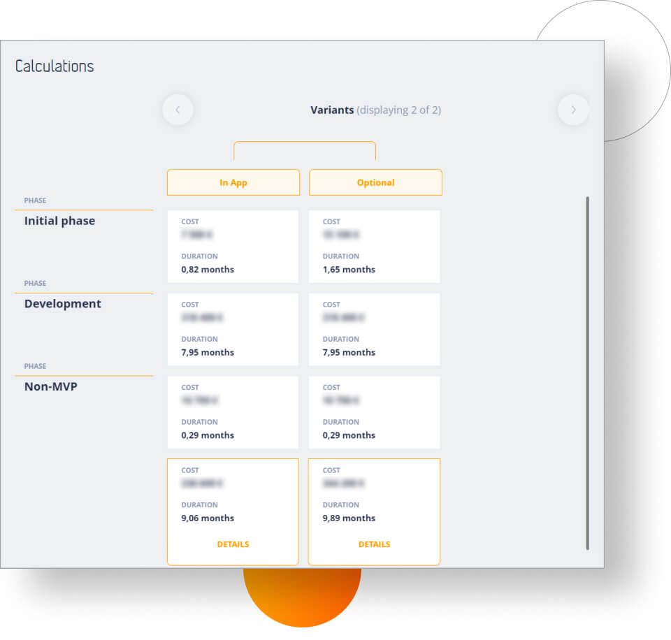 Using the Excel estimation sheet, we weren’t able to easily check how costly each phase is in each and every variation (optimistic, realistic, and pessimistic). Now, we have an in-depth view into potential costs — and this is presented in the form of an easy-to-read matrix (available in the Calculations section).