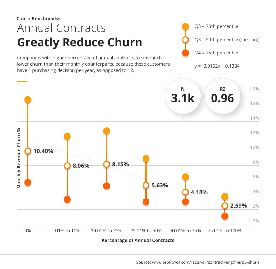Using month-to-month contracts, for example, if a company sells a service that costs $1,000 per month, keeping a customer for four additional months means the company can bring in an extra $4,000 in revenue per customer in a given period without spending more money on customer acquisition. Furthermore, yearly contracts increase customer retention as well since they allow for only one purchase decision to be made a year instead of twelve, decreasing the number of chances a customer has to leave and ensuring steady profit.