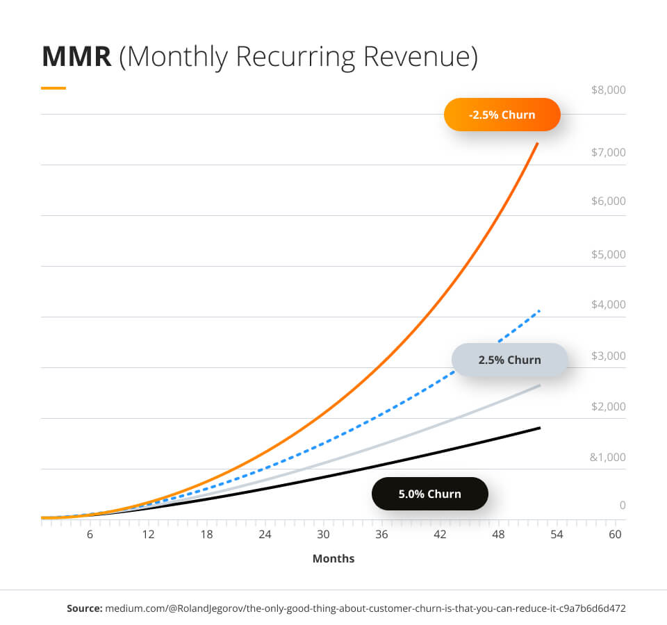 Customer churn rate is used to describe the rate at which customers stop using a product after a predetermined time. Churn occurs for a company when a customer cancels their service or leaves the company entirely. For businesses large and small, capitalizing on the customer satisfaction of existing customers is vital to higher profits from monthly recurring revenue and other recurring revenue occurrences. As seen in the graph below, a lower churn rate leads to a higher monthly recurring revenue.