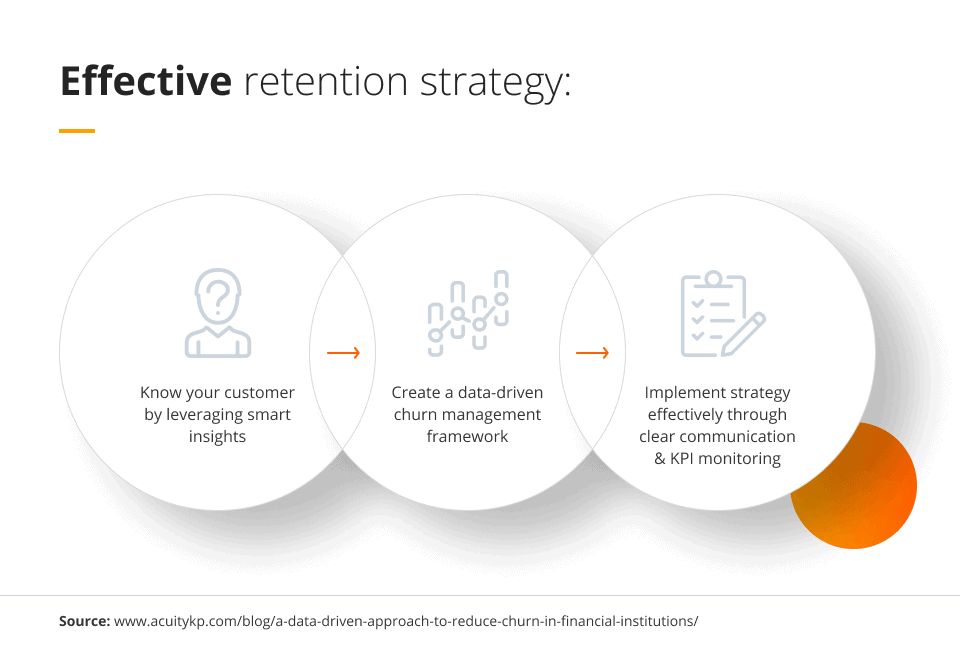 An important factor to include in churn strategies is to focus on high-quality leads. Using data to determine crucial information about a business’s customer base is key. Having an idea of how many customers engage with the business, customer lifetime value, and other historical customer data and churn data is essential to being able to predict churn and improve customer retention. Consolidating, analyzing, and applying this data in the form of algorithms can help identify which customers leave and generate a churn prediction for prospective customers.