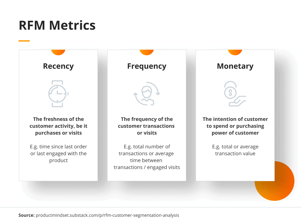 A similar but distinct customer-facing strategy is to segment the market to focus on retaining the right customers. Distinguishing between groups based on how customers engage with a business, such as via RFM metrics, is another vital step in creating customer churn strategies.