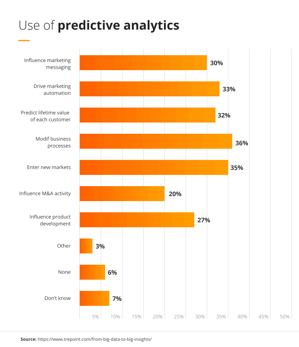 Now that it is understood that the churn rate can be heavily reduced with the use of data analytics, the specific considerations and best practices of using analytics to minimize churn must be evaluated. The graph below shows that companies most commonly use analytics to modify business processes like churn reduction. Like any step in reducing customer churn, incorporating data analytics into a business’s churn reduction strategy must be done the right way.