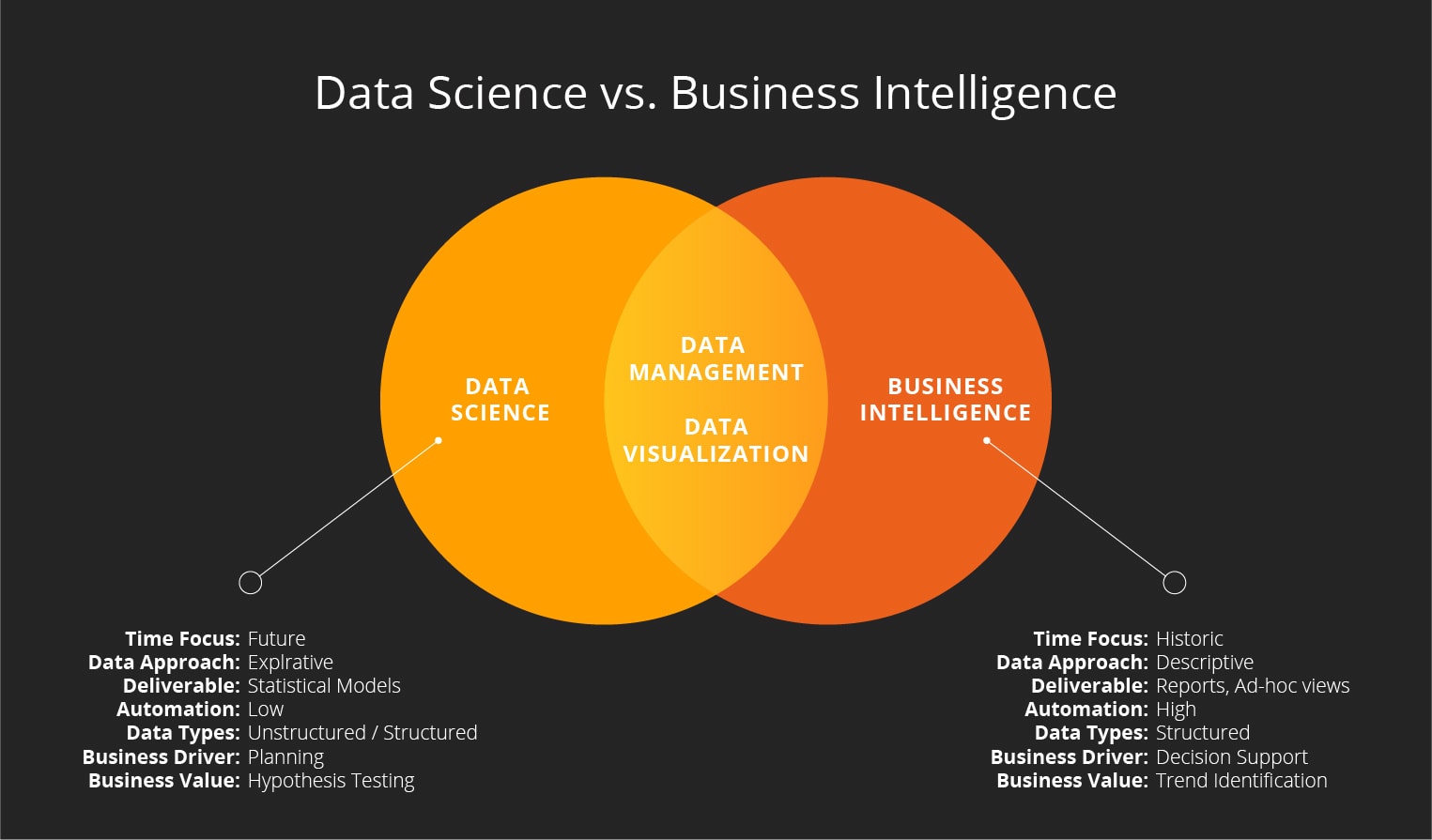 Of course, both BI and DS fall under the umbrella of data management and data visualisation, while also providing actionable insights. However, data scientists would rather take more of an exploratory approach to both structured and unstructured data, saving descriptive analytics for the BI experts.