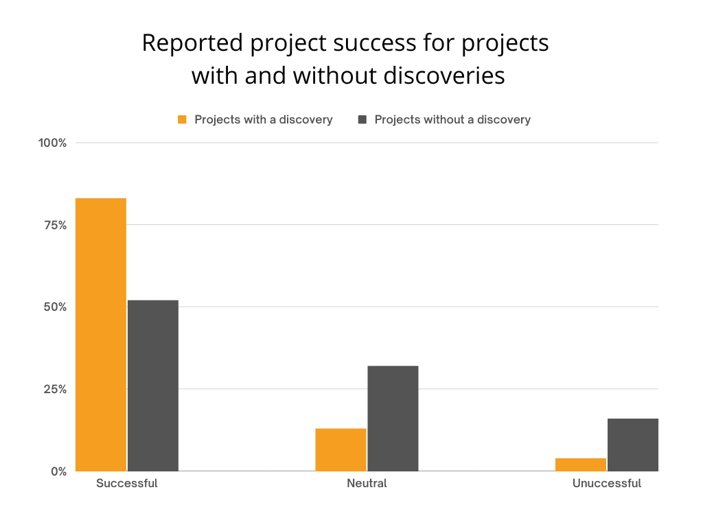 Research shows that projects which don’t include user-centred approach are much more likely to fail. In fact, performing a discovery for a project increases the chance of its success by as much as 59%!