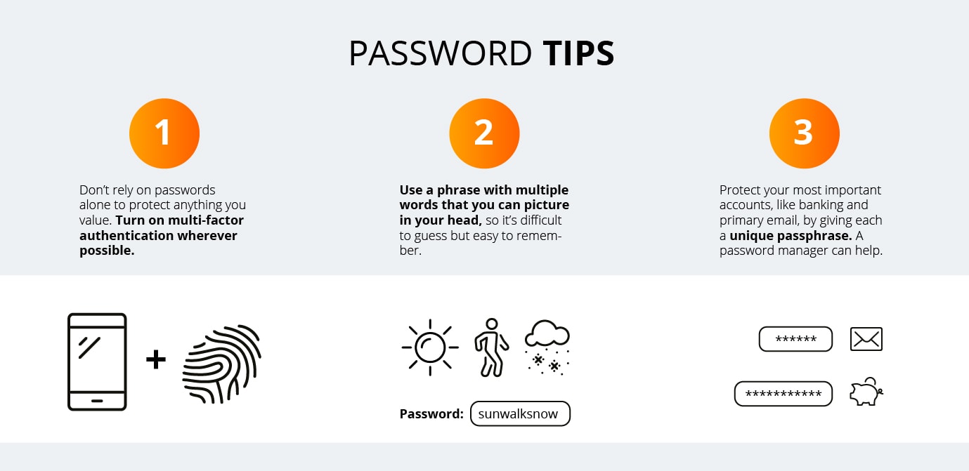 Instead of using a lot of different passwords that consist of various characters – uppercase, lowercase, special characters and numbers, which is super difficult for users to remember and apparently easy for a computer to guess – you should use unique passphrases. The best passphrases should be as abstract as possible but still make sense to you, personally.