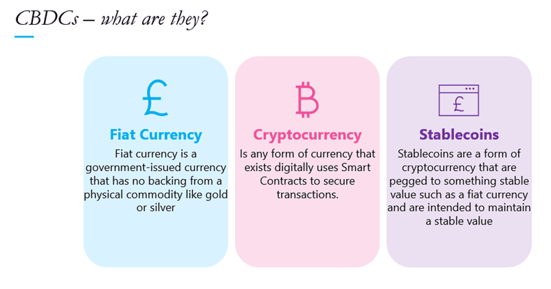 ‘CBDC Is a government-issued stablecoin. It is pegged to a Fiat currency, so one of it is equal to one of the Fiat. It is run on a blockchain, secured using the mechanisms we have discussed, and ultimately is issued by and controlled by a central regulator. In the case of the UK that would be the Bank of England and His Majesty’s Treasury.’ explained Bob.Bob Williamsthe Vice President, FinTech, Digital Assets & Blockchain Advisory at Lockton