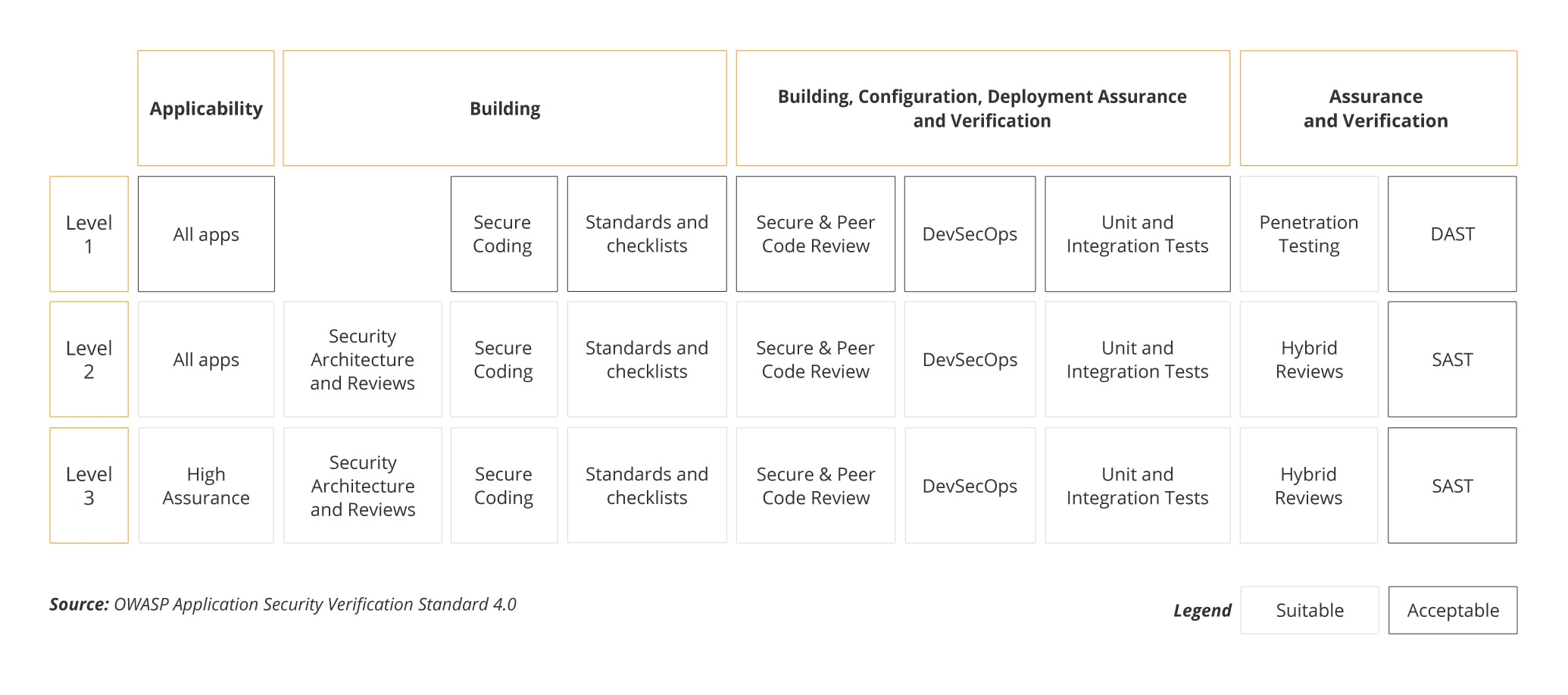 Application Security Verification Standard (ASVS) is more general, not focusing on mobile applications. It can be very useful when the product is more complex and consists of API and a web-application beside the mobile application. This document has similar structure to MASVS, but there is no Resiliency level and levels vary from 1 (bare minimum) to 3 (for military, critical infrastructure and “health & safety” areas).