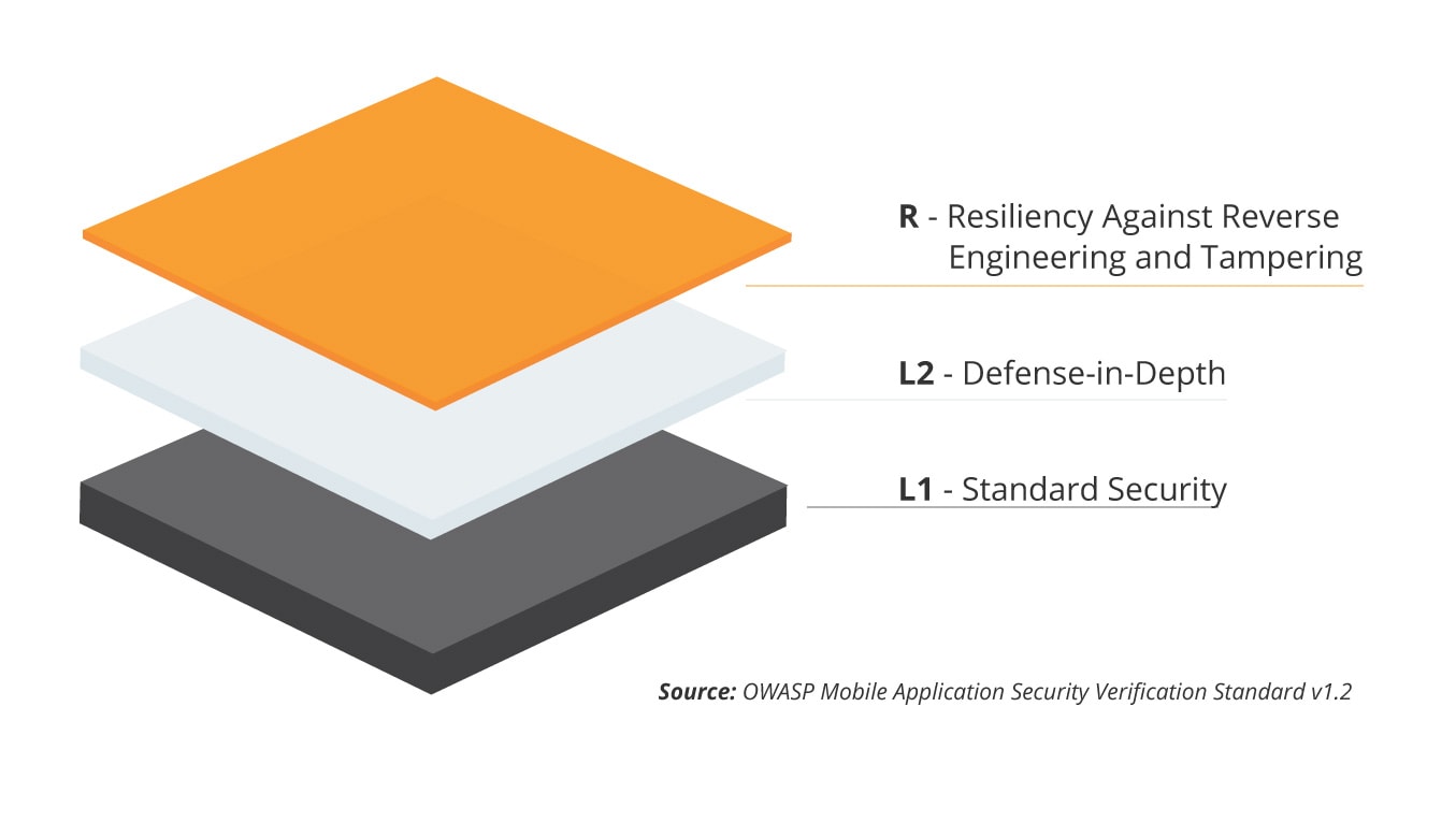 - MASVS-L2+R – for applications which store PII and whose wide range of supported devices and operating systems increases the need for enhanced resiliency. Also, applications relying on client-side protection when using in-app purchases can benefit from anti-tampering and anti-reverse engineering mechanisms. Lastly – for online banking which handles users’ funds on device exposed to potential risk.