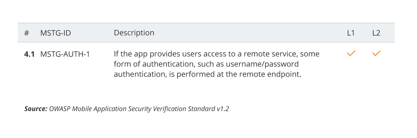 In MSTG, you can look for references of proper ID, in this case “MSTG-AUTH-1”. The ID appears two times in the “Mobile App Authentication Architectures” chapter (universal part for both platforms). First time in “Verifying that Appropriate Authentication is in Place” which contains steps to verify if proper authentication and authorisation are in place, and a second time in “Testing OAuth 2.0 Flows” describing best practices to follow and how to verify them. One more occurrence can be found in the “Local Authentication on Android” chapter under “Testing Confirm Credentials”. There, you can find the “Overview” section which explains how Local Authentication on Android works, the “Static Analysis” section with code snippets which help to indicate if functionality was introduced and in “Dynamic Analysis” on how to verify application in runtime.