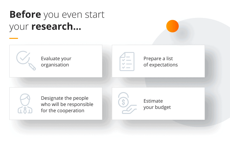 Select the people on your team who will be responsible for choosing the proper IT partner, as well as for handling the cooperation later, as it progresses, both in terms of business and technical aspects.