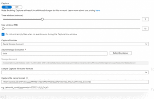 Azure Data Lake Storage Gen2 was chosen as data storage for option 1. Data recording from Azure Event Hub is carried out with the Azure Event Hub Capture mechanism, which allows you to save data from Event Hub to the storage in an Avro format. For PoC, Event Hub is configured as follows: