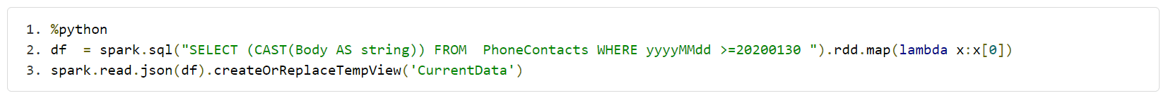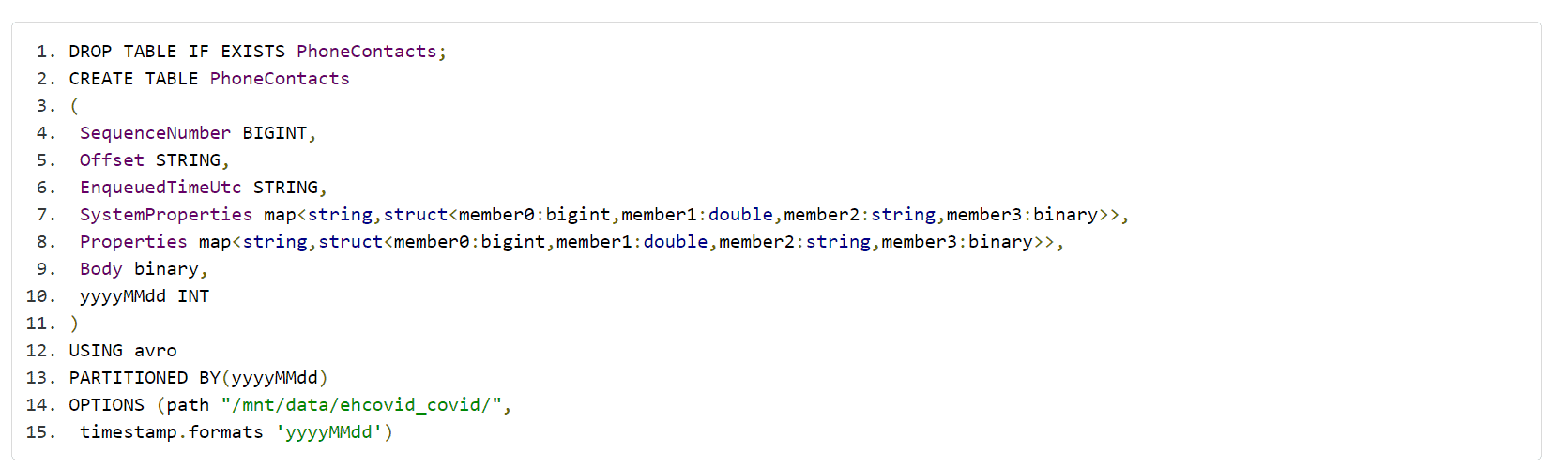 MSCK REPAIR TABLE PhoneContacts MSCK REPAIR TABLE PhoneContacts , - extract telemetry data from the Avro format (Body column in table PhoneContacts) for a given time interval (yyyyMMdd – data partitioning),