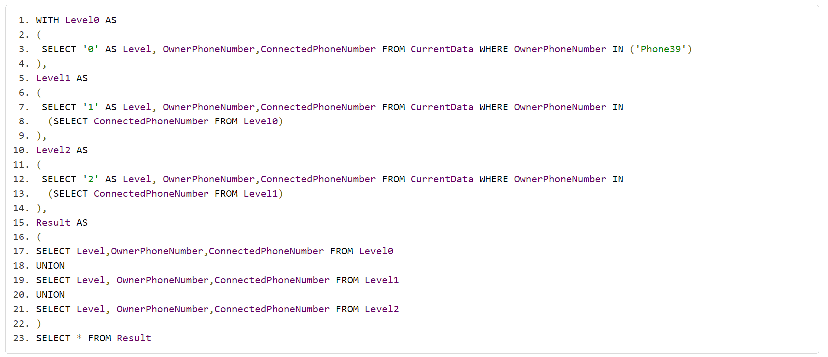 The query above returns information about the contact with people who have the phones ‘Phone54′,’Phone39′,’Phone56’ at the following levels:
