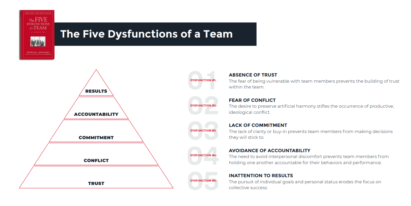 One of the most popular concepts describing difficulties faced by teams is outlined in The Five Dysfunctions of a Team by Patrick Lencioni. Lencioni presents five interrelated areas which determine the effectiveness of a group.