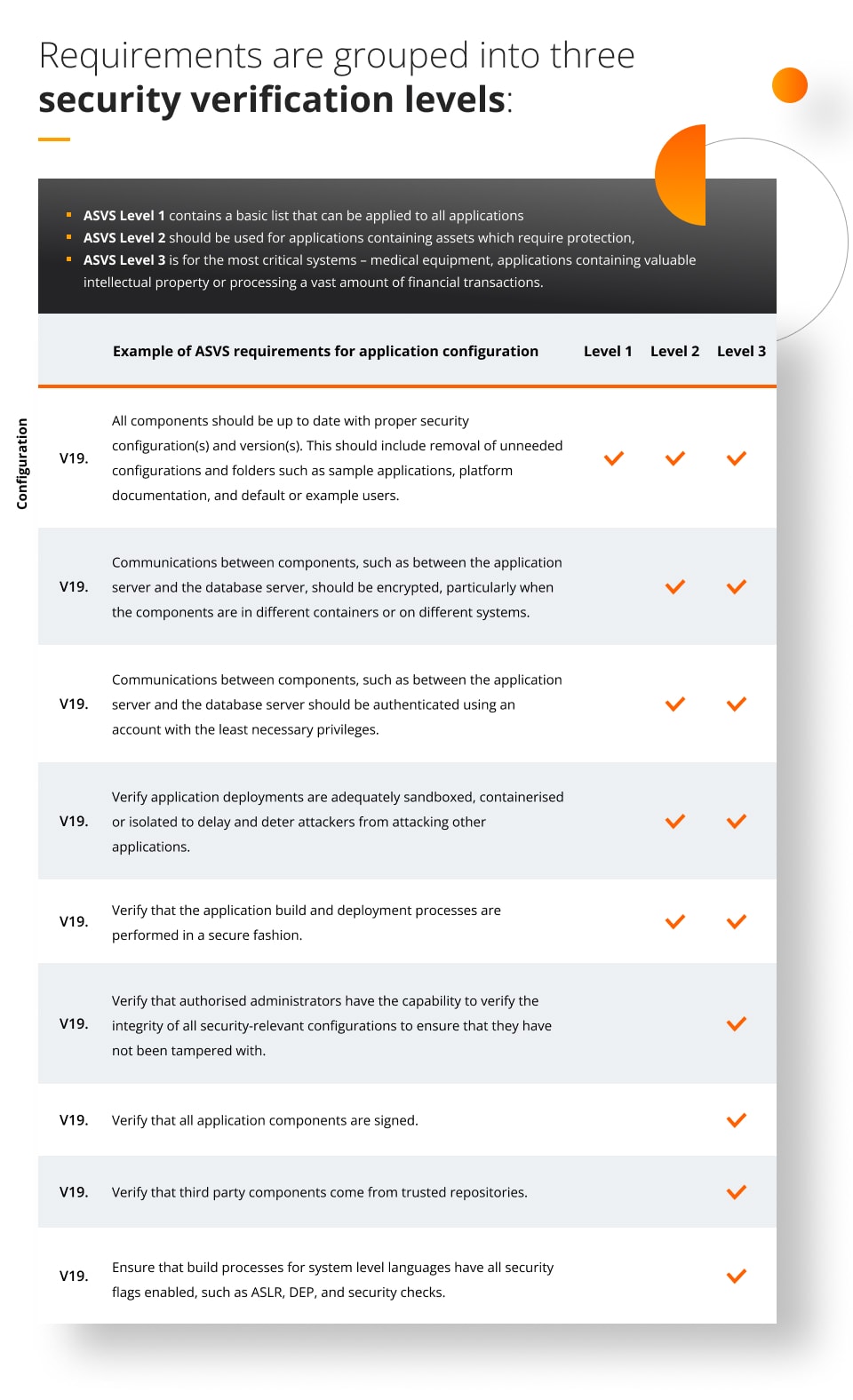 Requirements are grouped into three security verification levels: