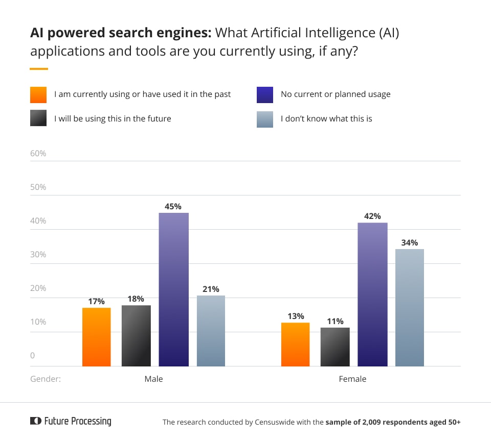 Now let’s take a closer look at the results of the survey. The research on the adoption of artificial intelligence tools reveals intriguing gender disparities among respondents. For men, 45% said they did not currently use or plan to use it, reflecting some reservations towards AI technology. Notably, 21% admitted they had no idea about these tools, 18% were forward-thinking, and 17% had previous experience with AI applications.