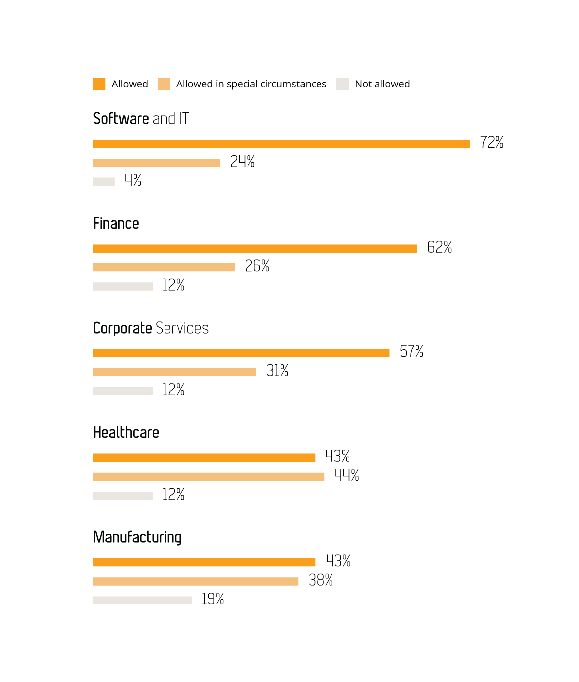 As you can see, 72% of IT workers are allowed remote work, compared to only 43% of professionals in the manufacturing and healthcare sectors.