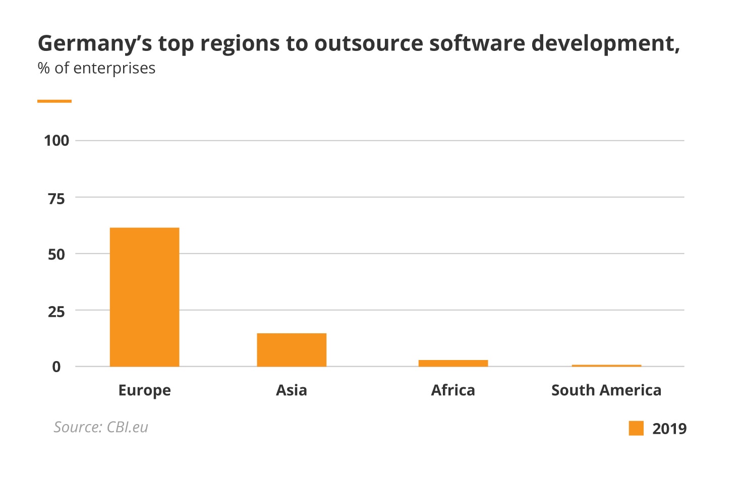 Statistics show that the preferred option for German-based businesses is nearshoring. In 2019, 77% of German enterprises nearshored their software development in Europe, while only 23% offshored it to countries based on other continents.
