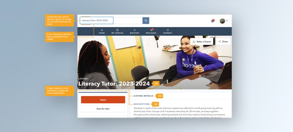 - Keyboard navigation – Service Year Alliance’s website is designed to be fully accessible with only a keyboard. This way, users who cannot use a mouse or other pointing devices can access all the features and functionalities.