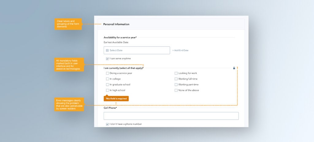 - Accessible forms – with clear labels, form elements, and error messages that are easily perceivable by screen readers and other assistive technologies.