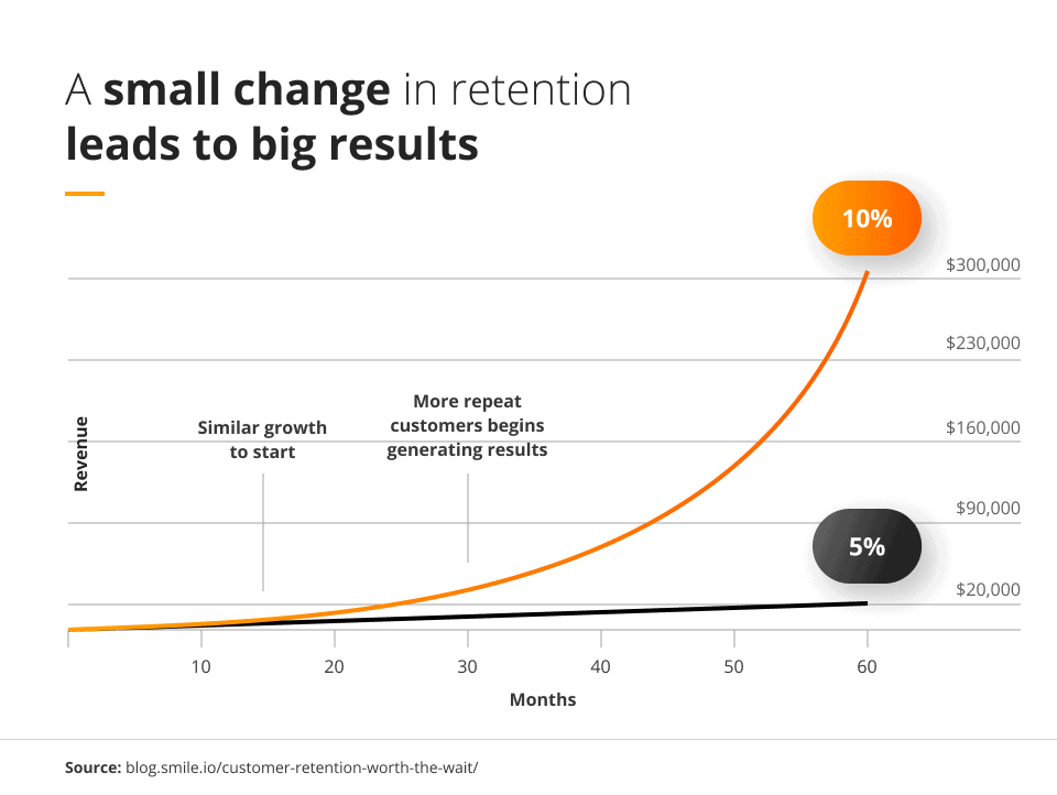 There are a plethora of ways to automate customer churn. However, automating these aspects will lead to the greatest benefits and keep bringing in new customers without sacrificing the customer experience. As seen in the graph below, a small change in retention leads to significant changes in revenue. Therefore, automating customer retention in as many ways as possible is vital to an organization’s ongoing success.