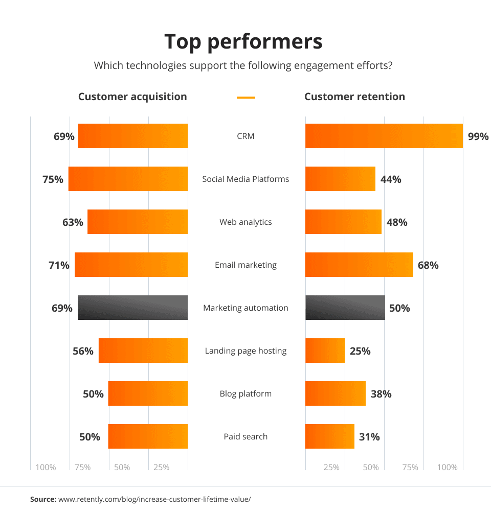 As seen in the graph below, marketing automation, which includes automating customer retention, is one of the top performers in engaging both new and old customers.